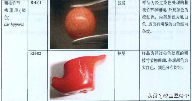 染色珊瑚大多数都是用浅海珊瑚中的粗枝竹节珊瑚Lsis hippuris (是竹柳珊瑚属的一种浅海白色珊瑚)染色制成的。而前面讲过天然的宝石级红珊瑚,属于深海珊瑚,是红珊瑚属和侧红珊瑚属。
