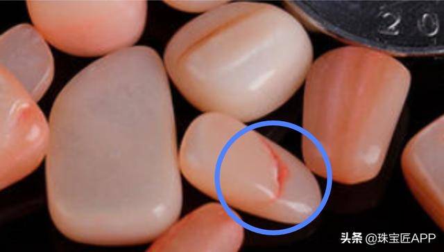 细看区分就很明显:女王贝还是具有贝壳的层状结构,而天然珊瑚有特征的生长纹理结构(横截面放射状,纵面波浪纹)。