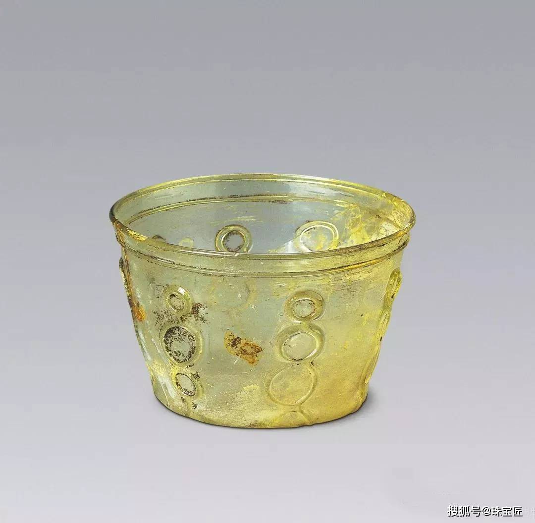 下有一圈凸起的弦纹,腹部有八组24个圆环纹装饰。凸纹玻璃杯的透明度也相对较高。