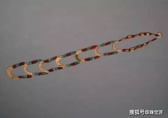 七璜联珠组玉佩,西周,河南博物院藏品。各璜之间以左右对称的双排两行玛瑙与琉璃(蓝色玻璃)串珠连缀而成