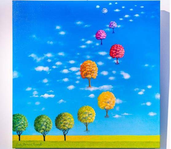 《飞往梦想的方向》,从左至右,一棵接一棵完美的树木排列合理,但是自某一时刻开始,从画布的中间,树木开始向上飞。随着云层形成一个海岸,我们看到树在邀请我们起飞,一并进入天空。