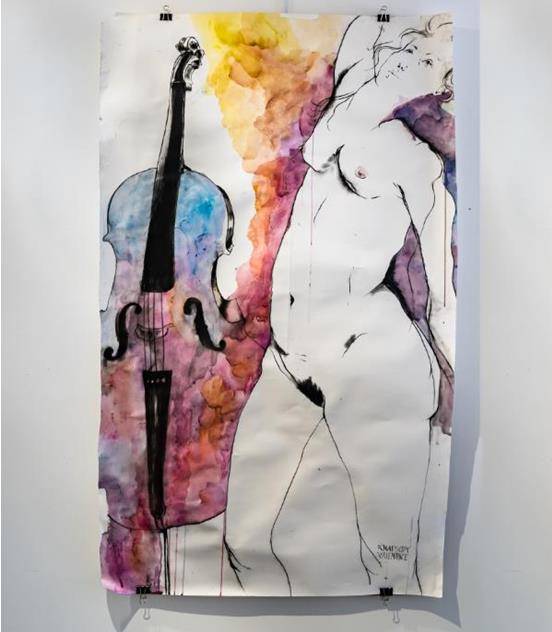 在《色彩的反置和溢出》中,我们看到一个大提琴和一个女人。