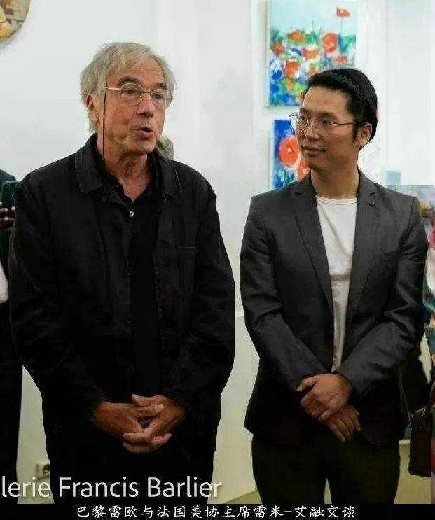 巴黎雷欧与法国美协主席雷米·艾融在“夏日绘彩”画展上交谈