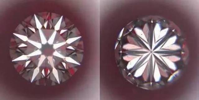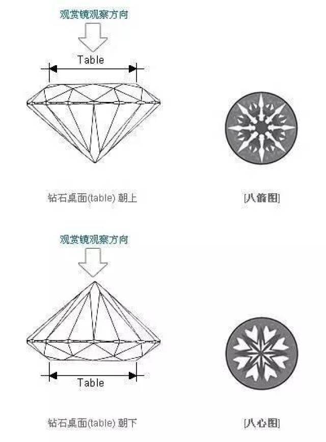 只要钻石的台宽比和亭深比控制在合理的范围内,都可以通过切工镜,在冠部看见八支箭,在亭部看到八颗心。