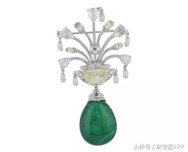 这枚胸针来自Amrapali Jewels,由50克拉的祖母绿和钻石构成,造型雍容华贵,其中钻石的切割更是采用印度斋普尔公司的专利——“莲花”切割。