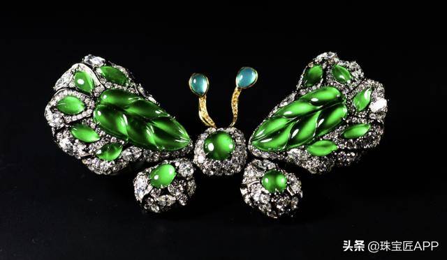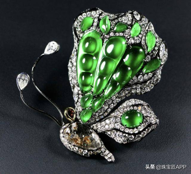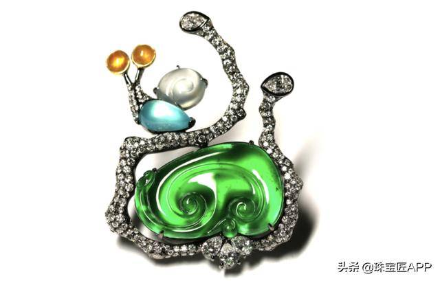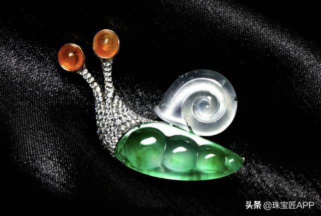 蔡孟翰却在传统造型上大胆诠释,把福豆变成了蝴蝶翅膀、蜗牛身体,树叶和如意也不再是凸显翡翠本身,而是融入设计中,成为设计语言的一部分。