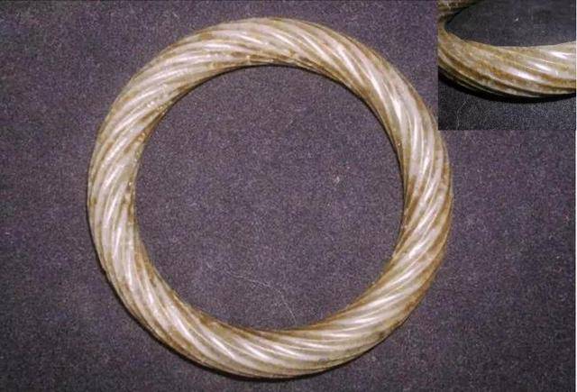上图就是1987年浙江省杭县安溪乡下溪湾村瑶山墓地中曾出土的手镯,呈白色,外壁有十三道斜向的凸棱,即使以现在的眼光来看,也十分时尚美观。