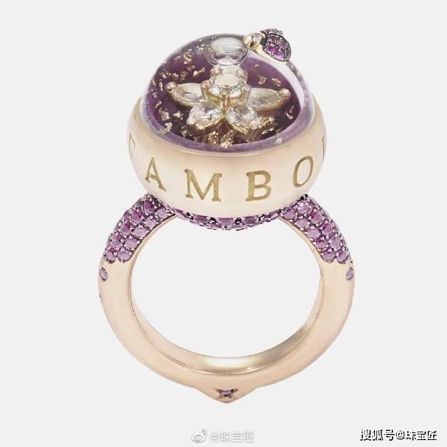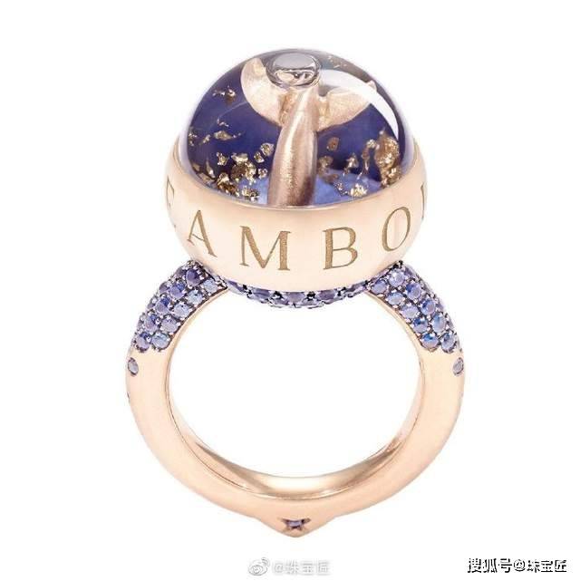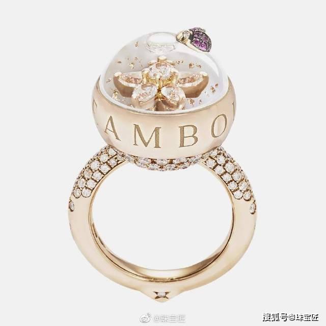 玲珑的球形戒面是由天然宝石打造的2个中空半球构成,直径仅16mm。球体中填入一种名为Dream Solution的中性液体,能够带动金箔缓缓浮动,稳定的特质让戒面中的贵金属、宝石不受损伤