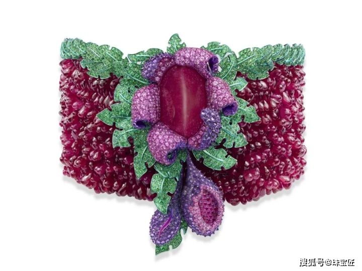 整件作品以玫红色为主色调,设计师运用沙弗莱、紫水晶、红宝石、粉色蓝宝石等彩宝来诠释浆果、叶片造型,中间一枚重达130克拉的弧面红宝石成为了整件作品的点睛之笔,造型十分壕气。