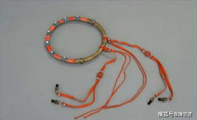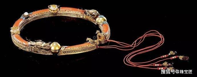 它的形制为一个镂金的圆环形状,有开合式的活口,环上镶嵌宝石,活口处垂下两条绦。