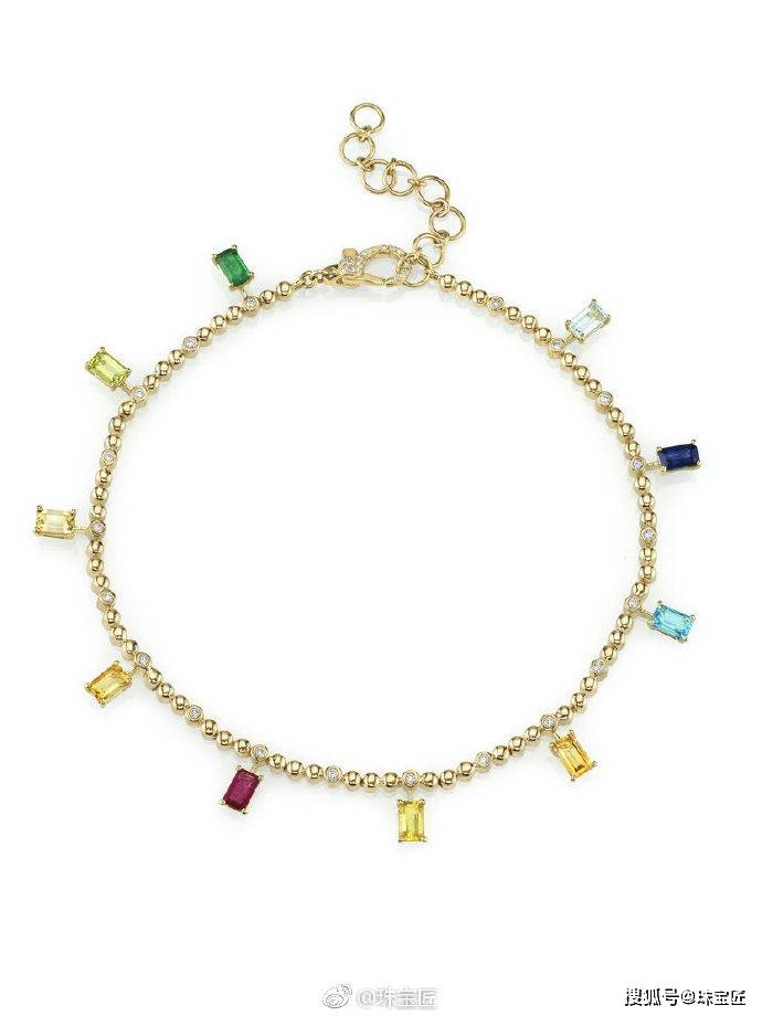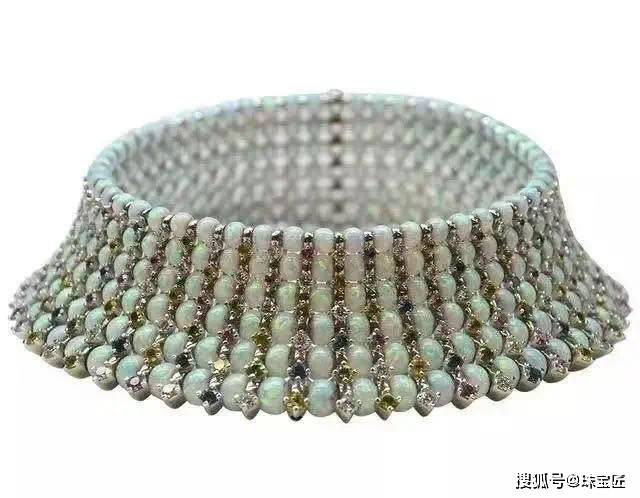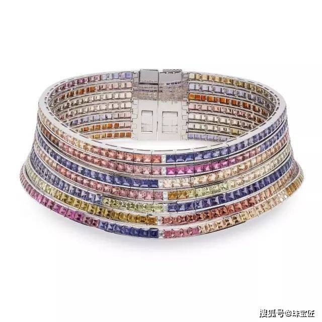 同样都是由各色彩宝镶嵌而成,Hermès 爱马仕的这款由7条独立的项圈层叠构成的Choker,宝色的配色更为饱满鲜明,富有张力。