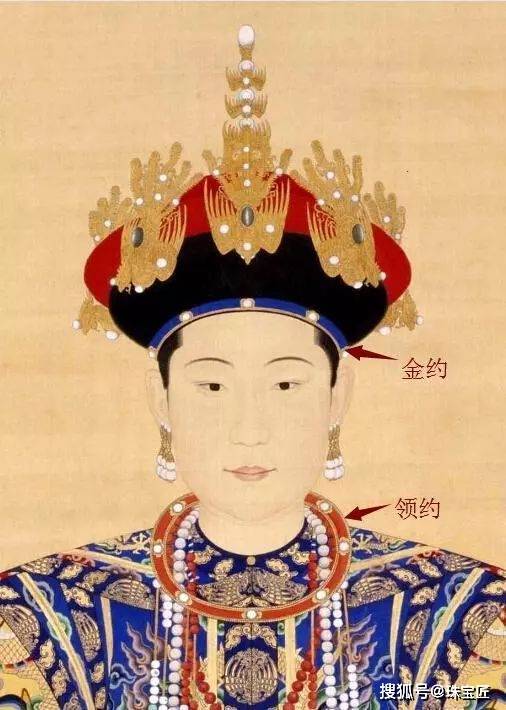 清代乾隆朝规定,宫廷里的皇太后、皇后、皇贵妃、贵妃、妃、嫔,高级宗室的妻室和女儿,宫廷外的一品至七品命妇,在穿着朝服时均应佩戴金约和领约。