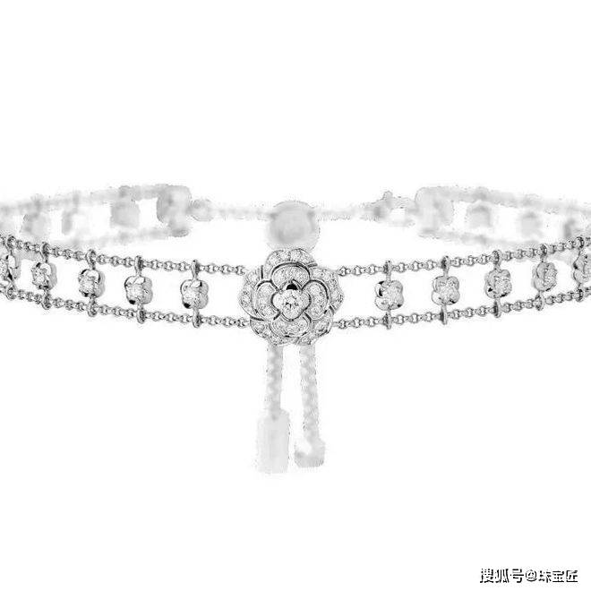 这款Chanel以品牌标志性的山茶花为主题设计的Choker,白金塑造的双链中间点缀一排小巧精致的山茶花苞,营造出蕾丝般轻盈的质感,正中间一朵钻石镶嵌而成的山茶花,十分吸睛。