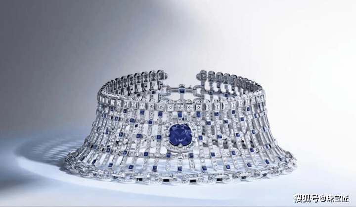 LV以中世纪骑士穿着的颈甲护具为灵感,运用方形蓝宝石与圆钻勾勒出交织的方格,中间一枚重达19.31克拉的皇家蓝蓝宝石,尽显大气奢华之范。