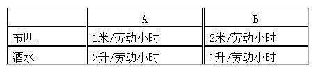 假设,A单位和B单位都生产布匹和酒水,A单位工人每劳动小时生产6米布或4升酒水。B单位工人每小时生产2米布或1升酒水。这样,B对A来说,生产效率属于完败状态。