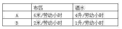 在布匹生产上,A与B的劳动生产率比例是6:2=3;在酒水生产上,A与B的劳动生产率比例是4:1=4。