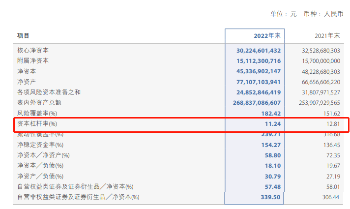 根据证监会发布的《证券公司风险控制指标管理办法》及配套风控指标的计算标准要求,证券公司资本杠杆率不得低于8%,预警标准为9.6%。