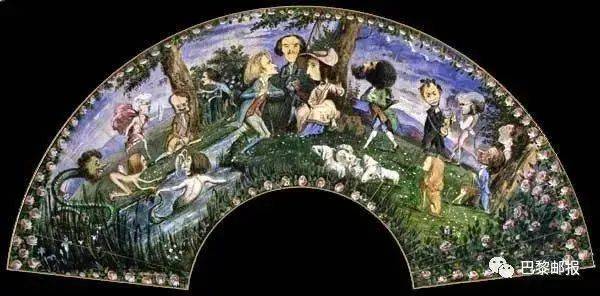 李斯特单膝跪着,树后掩着巴尔扎克,乔治·桑身右的大画家是德拉克洛瓦。