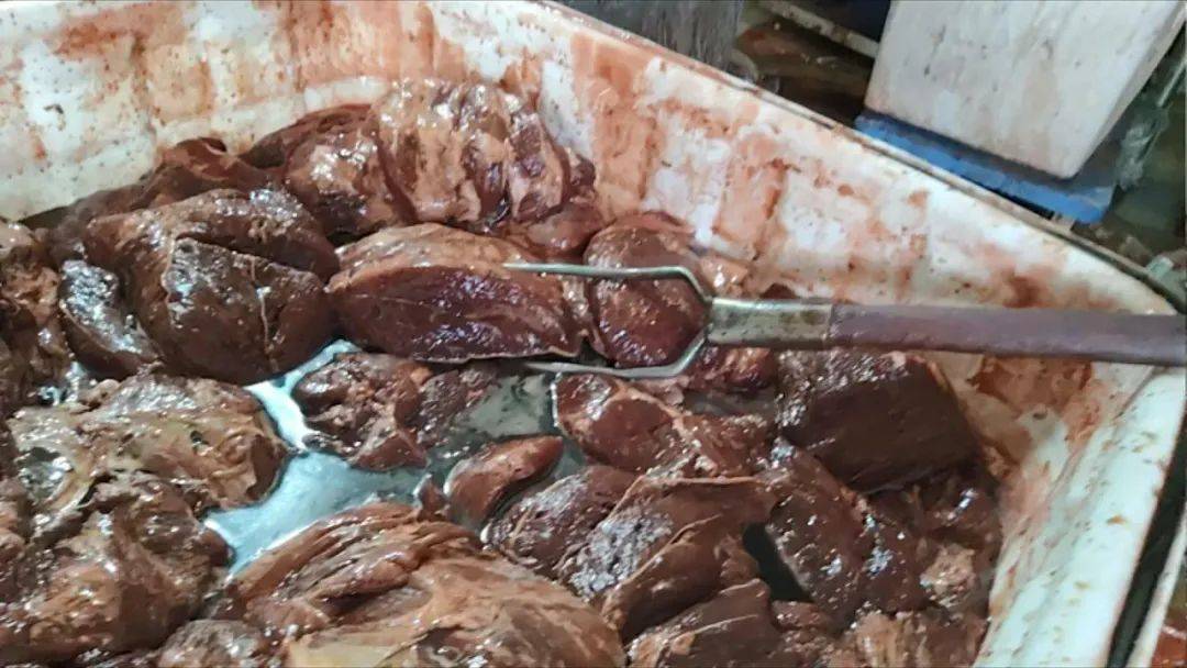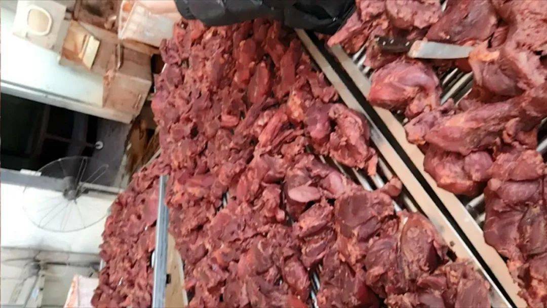 厂房内卫生条件极差,现场一片狼藉,地面上血水横流,腌制区还摆放着一台搅拌机,旁边放着几个沾满污垢的白色塑料槽,其中一个白色塑料槽内装着鲜红色的液体,另一个白色塑料槽则放了许多正在腌制的生肉。据老板介绍,他们家每天能加工出1600斤“驴肉”,价位最低的“驴肉”售价每斤仅9元。