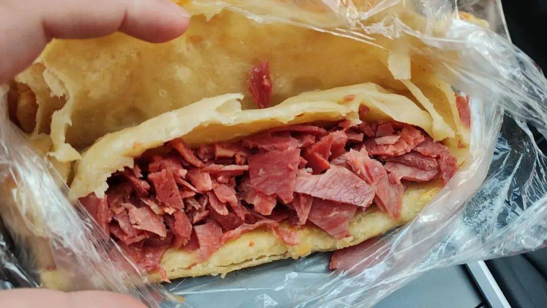 ▲记者在天津一家驴肉火烧店购买的“驴肉”火烧,经检测,火烧内夹的为猪肉。新京报记者 韩福涛 摄