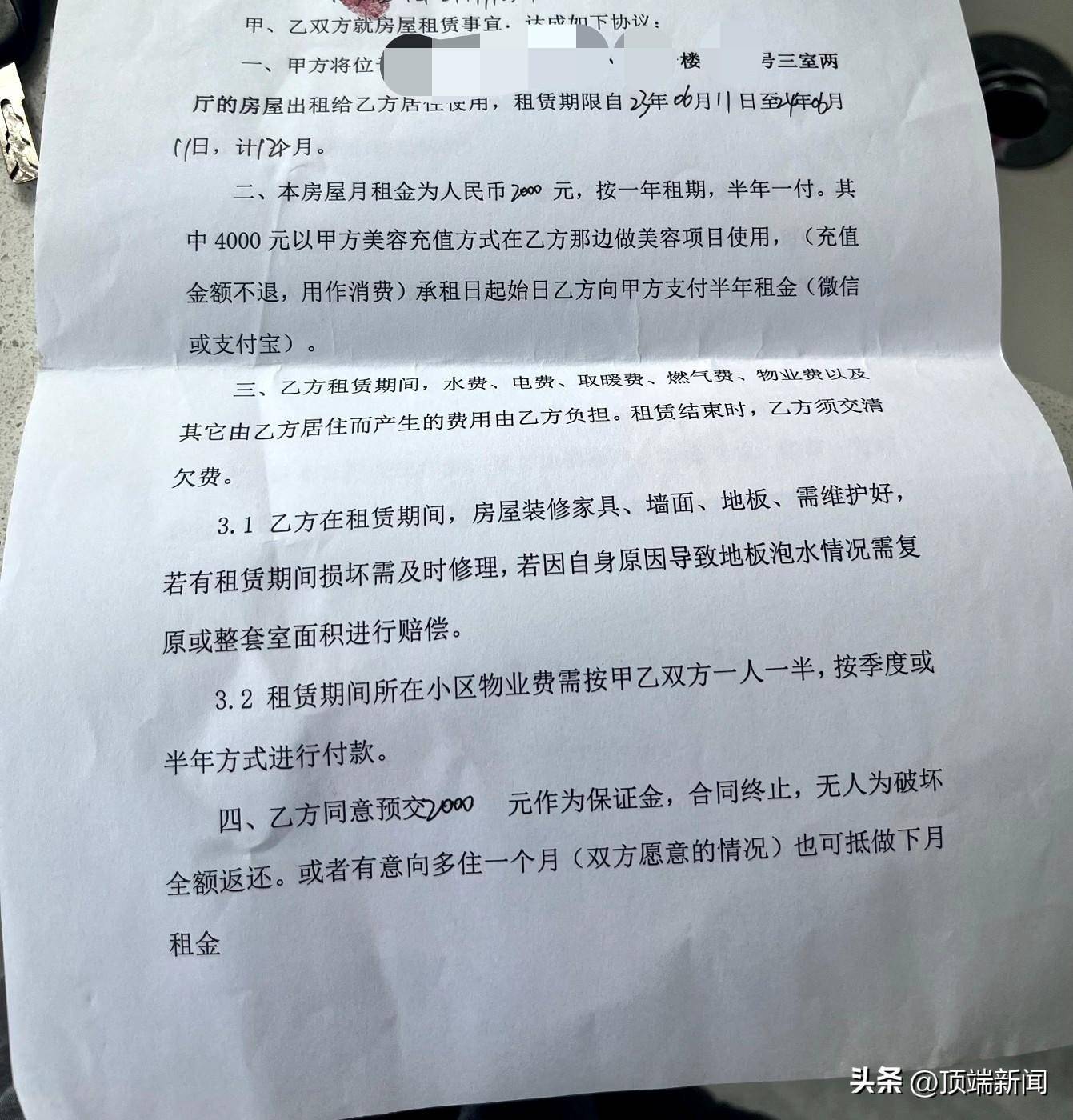 据朱女士发来的房屋租赁合同显示,双方约定房租租金为2000元每月,按一年租期,半年一付,押金为单月房租2000元。与此同时,双方还在合同中约定,其中有两个月的房租共4000元,以朱女士经营的美容场所会员充值的方式支付,也就是说朱女士将向房东提供价值约4000元的美容服务来抵消两个月的房租。